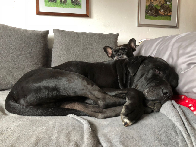 Simone (Leiterin des Tierheims Frankenthal) und ich albern immer rum, dass sie das von ihrem Bordeauxdoggen-Rüden Sam „geerbt“ hat, der der weltbeste Zieh-Papa für Jungtiere aller Arten ist und der sich natürlich auch damals super geduldig und lieb um Matilda und ihre Geschwisterchen gekümmert hat.