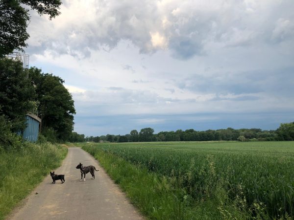 Als sie auf dem Rückweg endlich langsam entspannte und zumindest mal zusammen mit Matilda an interessanten Stellen schnüffelte, hörten wir plötzlich Stimmen. Zwei kleine Jungs auf dem Weg zur Schule, die sich ganz ruhig unterhielten. Für einen normal aufgewachsenen und sozialisierten Hund etwas völlig Normales, aber für Sofia bedeutete dies gleich ALARM!