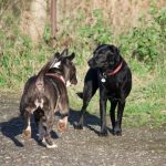 Sofia war durch die Gesamtsituation überfordert und durch die Tierheimumgebung arg verunsichert (Verkehrslärm, Bellen, fremde Gerüche). Sie hat sich also weder voll und ganz auf den Spielpartner einlassen können noch ihm deutlich zeigen können, wann es ihr zu viel wurde. Boogie wollte aber zu gerne (körperbetont) mit ihr spielen und hat sie immer wieder aufgefordert. Anrempeln, Pfoten wegziehen, spielerisches Beißen, Kleinmachen, Purzelbäume, aber auch Auf-den-Rücken-Legen und Pföteln. Also das volle Programm.