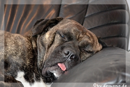 Simba schlief tief und fest auf der Couch, träumte süße Hundeträume… und hatte dabei die Zungenspitze draußen. Als er nun von unserem Lachen wach wurde, guckte er uns nur minutenlang verständnislos und immer noch arg verschlafen an. Die Zunge blieb aber weiterhin draußen.