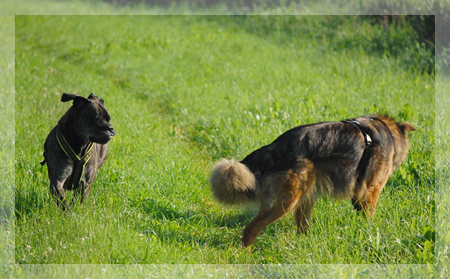 Der gemeinsame Spaziergang verlief völlig unspektakulär. Jede Hündin ging ihrer Wege und man nahm keinen direkten Kontakt auf, doch zumindest entspannten sie sichtlich, trabten locker und dicht aneinander vorbei und Vega war es auch schnuppe, als Lisa sich für Leckerchensuchspiele hopsend in Bewegung setzte.