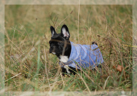 Mein Mann hat gestern auf die Schnelle aus dem Ärmel einer alten Softshell-Jacke ein Mäntelchen improvisiert, weil’s hier so kalt und windig ist: Ärmel aufgetrennt, auf die richtige Rückenlänge zurechtgestutzt und dann zwei Klettverschlüsse drangenäht.