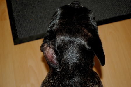 Dies ist mir aber egal. Hauptsache, dass Ohr ist nicht mehr so dick und knubbelig, dass es Mortisha so schrecklich unangenehm ist…und dass sie das Ohr wieder so weit oben tragen kann, dass es den Gehörgang nicht komplett dicht macht. Durch die schlechtere Belüftung des Ohres in Kombination mit Tishas starker Ohrenschmalzproduktion befürchte ich nämlich auf Dauer Folgeprobleme durch Entzündungen & Co.