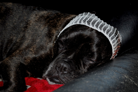 Obwohl Mortisha weder stark noch lange nachblutet, bekommt sie anfangs immer noch ein Verbandsnetz um den Kopf gelegt, um zu verhindern, dass sie durch Kopfschütteln dann doch im Umkreis einiger Meter alles vollspratzt. Sie findet das allerdings – wen wundert’s? – ziemlich doof: