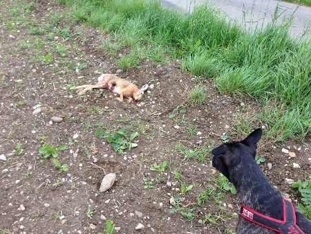 Dann entdeckten Simba und Vega am Feldrand einen toten Feldhasen, den sie äußerst interessiert abschnufelten. Die beiden ließen sich aber glücklicherweise sofort abrufen…. bei den M&Ms hingegen musste ich recht schnell ins Geschirr greifen bzw. auf die Leine treten, um sie von einer näheren Inspektion (oder Schlimmerem *schauder*) abzuhalten.